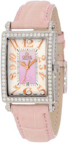 Part of Gevril's prestigious Avenue of the America collection, this automatic stainless steel men's timepiece (model 5035) features a delightfully illustrated moon phase function at the center of the dial. With an updated retro feel that blends a sense of history with current style, the watch offers a bevy of small artistic flourishes including a uniquely patterned guilloche dial and a highly stylized Arabic numeral display that is raised off the surface of the dial. Measuring 44mm wide (1.73 inches), the large, tall rectangular case makes a statement, but it conforms easily to different wrist sizes.The watch case and highly polished bezel are made from surgical grade 316L stainless steel, and it's complemented by a supple brown crocodile leather strap with tonal stitching. The silver dial includes rose gold-tone Arabic numerals, three-handed movement, and a day-and-date dual window sitting below 12 o'clock. Other features include a 25-jeweled automatic movement with a 40-hour power reserve, curved sapphire crystal for excellent scratch resistance, and water resistance to 50 meters (165 feet)--suitable for swimming but not for diving.